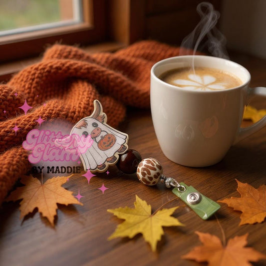 Highland Cow Ghost Badge Reel: Spooky Halloween ID Clip